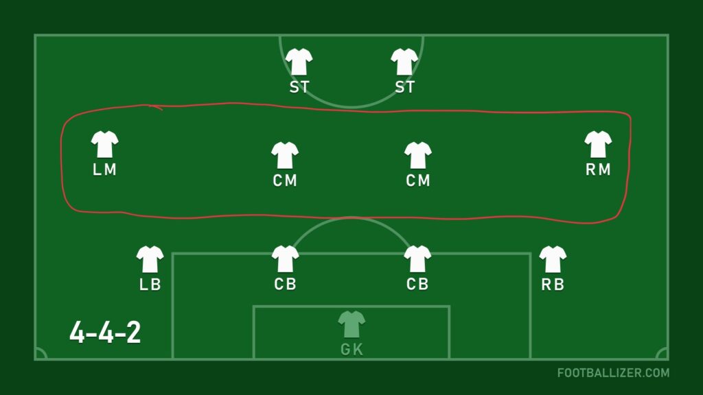 And although I’ve played a lot of football in the midfield line of a 4-5-1 formation myself, I couldn’t help but realise these recurring patterns in how the unit of 5 worked to defend the middle of the field (with that middle moving with respect to where the ball is). And while Fifa isn’t the best representation of football, it did do a good job of spurring some thought about the formation outside of the game.