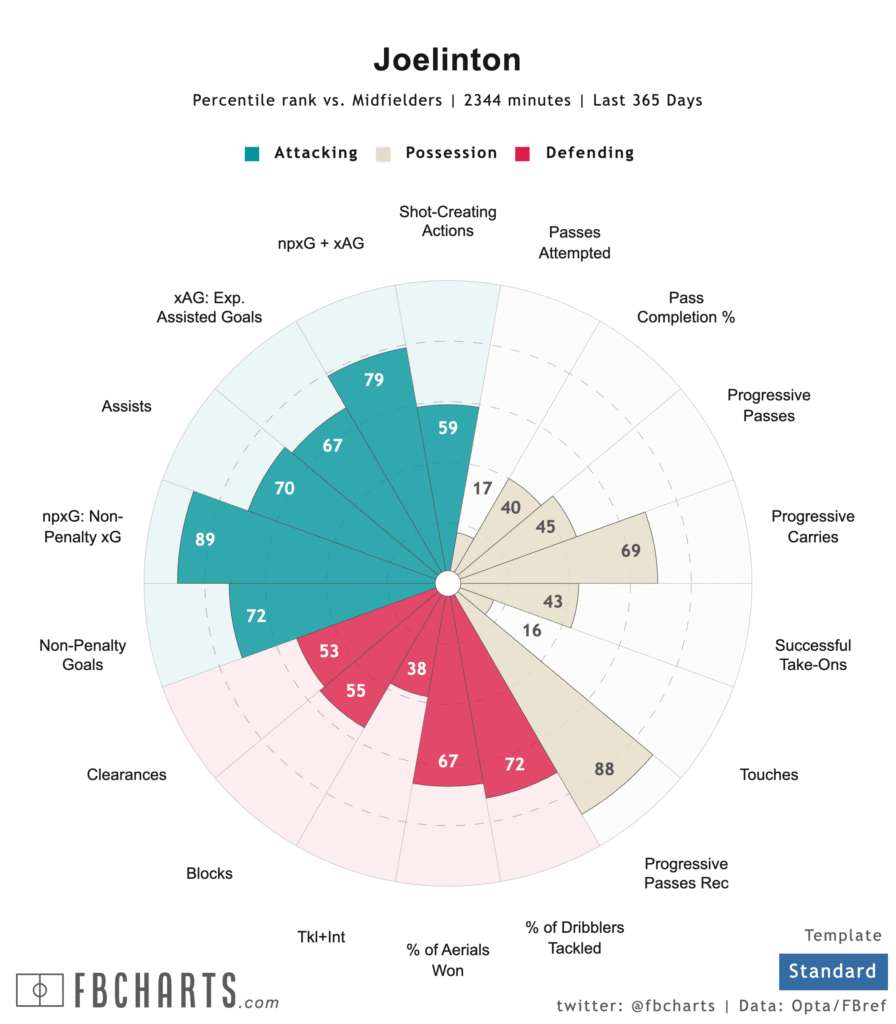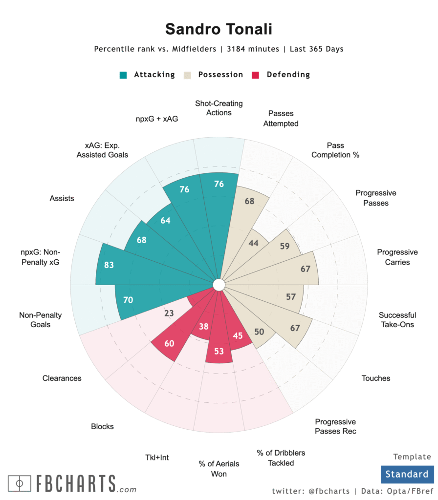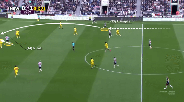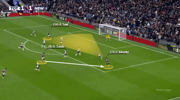 Behind him was a physical midfield of Bruno Guimaraes, Sandro Tonali, and Joelinton who were all primarily tasked with winning the ball back and progressing play quickly. Guimaraes’ 91st percentile progressive passes, Tonali having above average statistics in almost every facet of the game, and Joelinton’s progressive carries and defensive metrics act as evidence of this. Their particularly low pass completion metrics (39th percentile, 44th percentile, and 40th percentile respectively) also indicate that the system had them sacrifice safety in possession for higher risk and potential reward – with that reward often being a goal for Alexander Isak.