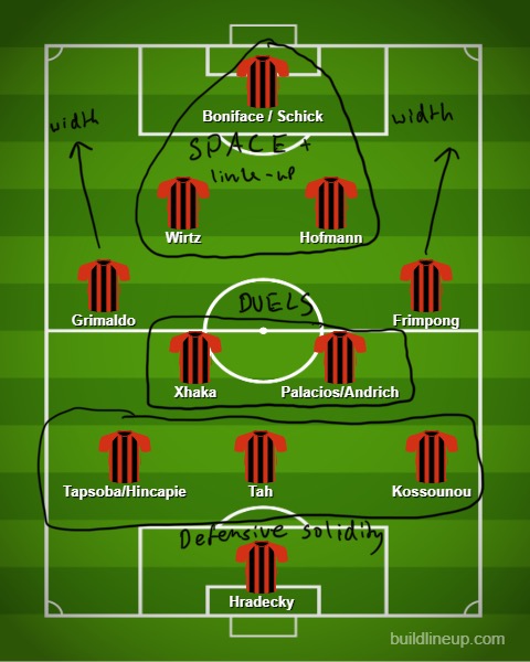 The way Leverkusen set out was almost perfect for Wirtz in the sense that almost every one of his teammates did something to accentuate his strengths and mitigate his weaknesses. Whether that was the space and vertical threat created by his wingbacks, Grimaldo and Frimpong, the intricate link up Victor Boniface and Patrick Schick brought to the team, the duel-winning midfield of Xhaka and Andrich, or the fact that he played as a forward in a 3-4-3 which lessened his defensive responsibilities. Everything Leverkusen did helped Wirtz look like the superstar that he is capable of being. At Liverpool, those circumstances are yet to be in place around him, and it shows.