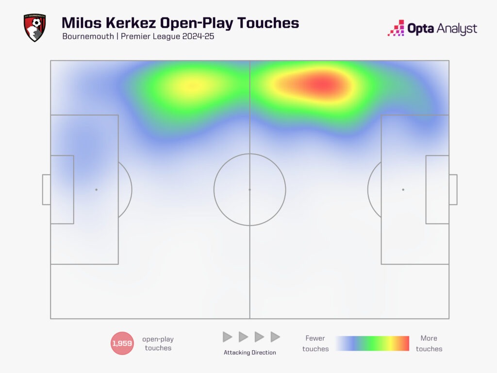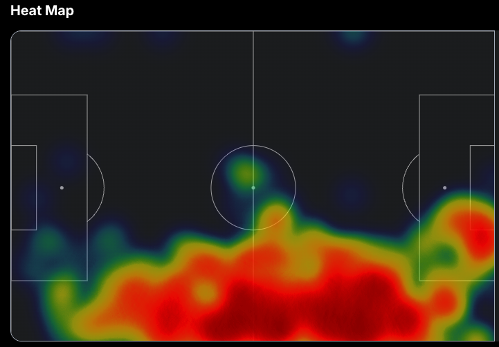 Kerkez has yet to be fully unleashed down the left wing where he was so dangerous for Bournemouth last season. And the heat maps from this and last season show that he hasn’t been able to be as advanced as he was last season. And even though this season’s map tracks his overall positioning and last season’s tracks his touches, we can see and infer, from the amount of time he has spent in very deep positions and lack of final third involvement, that his role has changed quite considerably.