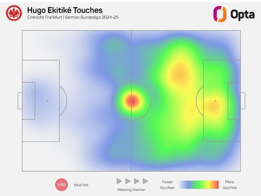The best performer of the new signings thus far has been Hugo Ekitike, and his relative success acts as further reinforcement of my point that the system often makes the player, in terms of how well they perform when changing clubs at least. Ekitike’s role in Liverpool’s team is not too dissimilar to the one he had at Eintracht Frankfurt last season. He is given license to drop into the tip of the midfield and link up with the other midfielders to allow himself to be involved in build-up, before eventually finding himself further up the field to finish off the chances he helped build.